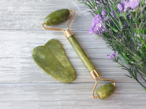 Нефрит натуральний, масажер ролер 14см + скребок для обличчя Гуаша 7 см,, 2-358